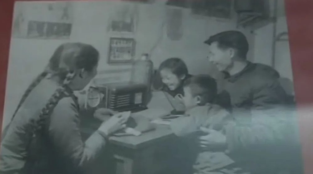 老照片上听广播的一家四口