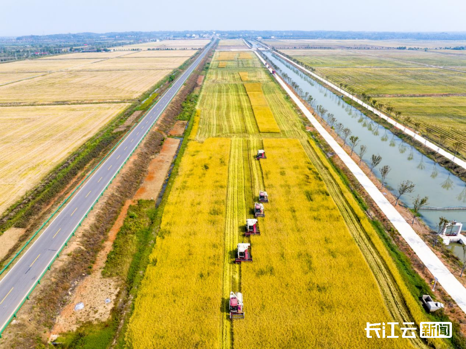 在该园区,长江云新闻记者看到,一望无涯的稻田里,收割机正来回穿梭着,颗粒饱满的水稻被卷入收割镰刀之中,确保颗粒入仓。机械的轰鸣声与稻谷的沙沙响声交织成一曲丰收的乐章,回荡在田野之中。