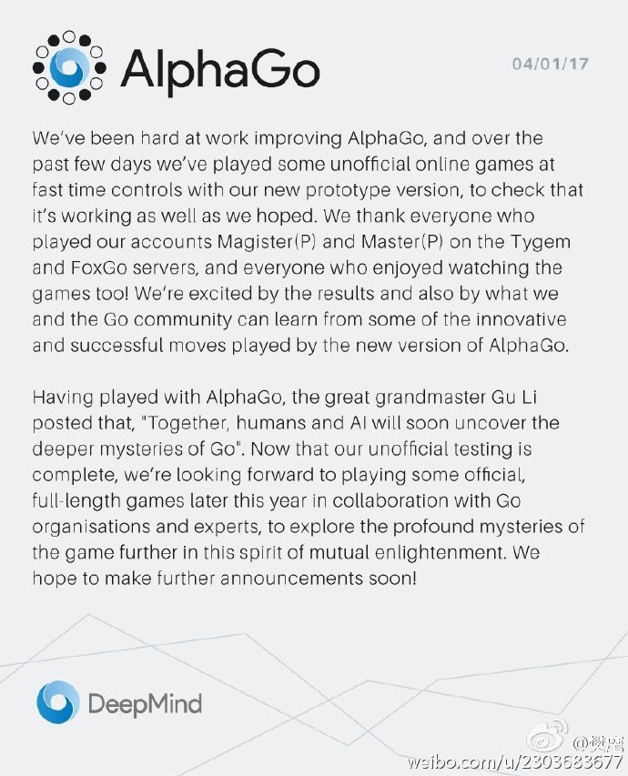 昨晚11点,Deep mind团队另一核心成员樊麾二段在微博发表公开声明,“我们最近很努力地开发阿尔法围棋,刚过去的几天我们在网络的对弈平台进行了一些非正式的快棋对局,目的是为了检验我们最新版本的阿尔法围棋是否如我们的预期。我们需要感谢所有与我们的 Magister(P) 和 Master(P) 账户在弈城围棋网以及野狐围棋网对弈的棋手,也要感谢所有观战的人!最新的阿尔法围棋在对局中所富有启发性的创新,我们从中可以学到的,以及对局的结果都令我们非常激动。世界冠军古力与阿尔法围棋对弈以后写了,‘人类与人工智能共同探索围棋世界的大幕即将拉开’。我们现在结束了非正式的测试,非常期望今年能有机会与围棋组织以及专家共同探索神秘的围棋,在相互启发的气氛中共同领会围棋的奥妙。我们希望尽快发布其他公告。”