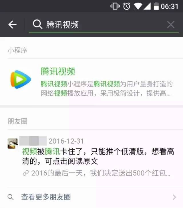 值得注意的是,如果是对具体信息进行分享(如一个视频),点击进入后无法回到该小程序的主页进行其他动作(比如查看其他视频、查看其他股票)。这时候需要通过“发现”-“小程序”进入刚刚朋友分享给你的小程序才可进行全面使用,这与从第三方分享单一商户信息类似,但仍不如包含菜单的微网页(如微店)方便,不知道今后会不会改善。