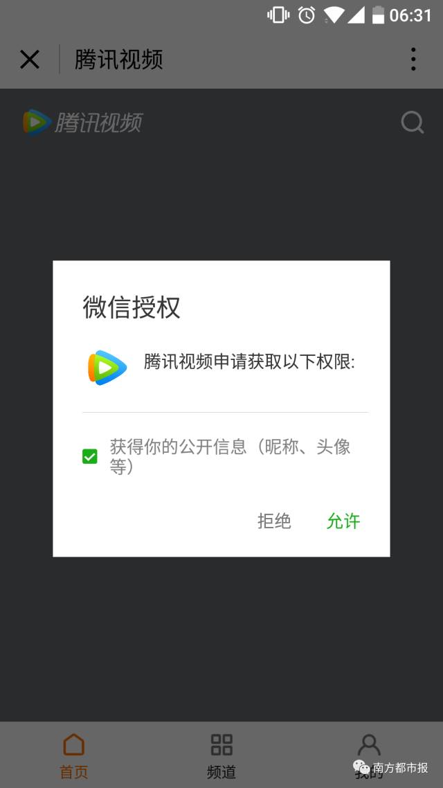 打开“腾讯视频”小程序,如同早前不少公众号开发模式、H5、微网页等,首先要对用户信息、地理位置等授权进行选择。