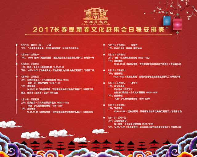 送灶、接灶的开始,预示着春节的即将到来,同时也是武汉长春观2017年新春文化赶集会的开始。如果您厌倦了一成不变地窝在家里看春晚,接亲访友走过场,赴完饭局赴酒局,赴完酒局去K歌的闹腾而乏味的春节,不如来到长春观看看我们的新春文化赶集会。武汉长春观于2017年1月21日(腊月二十四)起,至2017年2月11日(正月十五),举办长春观新春文化赶集会。在原有的民俗庙会基础之上,注入更多新的文化元素,以“关注民族传承,关爱文化成长”为主题,分“拜财神、迎太岁、亲国学、看大戏”四大板块,开展一系列跟国学、围棋、书法、绘画、武术、民乐、舞蹈、吟诵、体育等等相关的传统文化少儿传承亲子活动。也就是说,在今年的长春观庙会,您不光可以来到长春观求财神、拜太岁、求平安、逛庙会、吃小吃,还可以带着一家老小,参加文化体验活动:或下一局围棋对弈;或听一听少儿民乐演奏,看一看少儿舞蹈;跟孩子体验一下经典国学吟诵;做一次篮球障碍赛体验;玩一次“你画我猜”的少儿绘画亲子游戏,老年朋友们也能体验到传统戏曲、曲艺艺术的魅力。来吧,朋友们!在长春观赶一场文化集会,过一个喜庆热闹,富含文化体验的祥和春节!