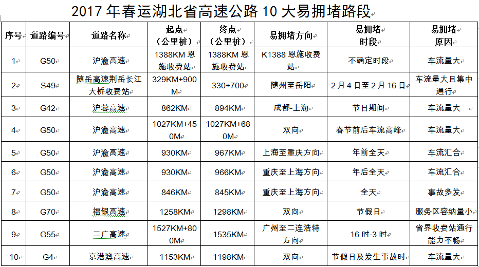 湖北省公安交管局同时公布了春运期间高速公路10大易积雪结冰路段、10大易拥堵路段。其中G50沪渝高速拥有4处易积雪结冰路段和5处易拥堵路段,经行该路段的司乘人员需格外注意。湖北省公安交管局提醒广大交通参与者:出行前应掌握车况、路况、天气情况,如遇雨雪雾等恶劣天气或者通过易结冰路段,要谨慎驾驶,降低车速、注意观察、减少变道超车、切不可急打方向、急踩刹车。遇交通拥堵时要听从交通警察指挥,不要频繁变道、占用应急车道。