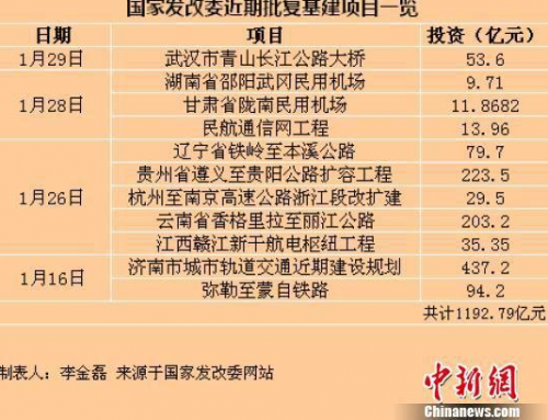 更早前的1月16日,国家发改委批复了新建弥勒至蒙自铁路项目、济南市城市轨道交通近期建设规划,这两大项目总投资为531.4亿元。至此,从1月16日至1月29日,国家发改委先后分四批次共批复了11个基建项目,总投资达到1192.79亿元。
