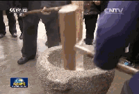 △ 习近平主席和井冈山老区乡亲们一起打糍粑。