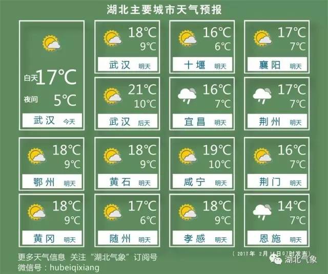 预计今天全省各地最高气温大都有15-17℃,武汉城区高温会升到18℃,出门过节的美眉们,可以甩掉羽绒服,穿上漂亮的裙子和大衣,美美哒。不过恩施地区今天有短时小雨,外出最好带上雨伞哦。