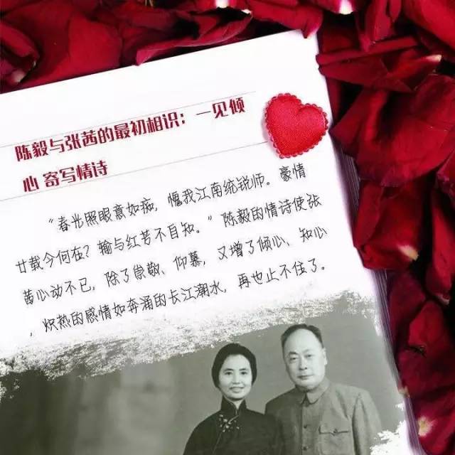 一见倾心 寄写情诗:“春光照眼意如痴,愧我江南统锐师。豪情廿载今何在?输与红芳不自知。”陈毅的情诗使张茜心动不已,除了崇敬、仰慕,又增了倾心、知心,炽热的感情如奔涌的长江潮水,再也止不住了。