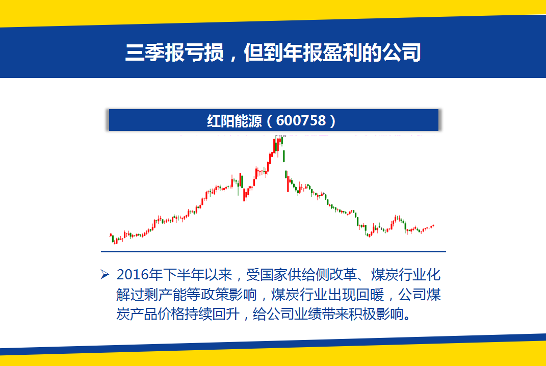 当然这种重组导致业绩大幅度上升的情况应该是最多的,不过也有依靠自身经营状况改变而业绩提升的,例如红阳能源,3季度报告时候还亏损3亿以上,却在1月25日发布公告称预计全年实现利润1.5亿元,理由那是相当的充分:2016 年下半年以来,受国家实施供给侧改革、煤炭行业化解过剩产能等政策因素影响,煤炭行业出现回暖,公司煤炭产品价格持续回升,给公司业绩带来积极影响。