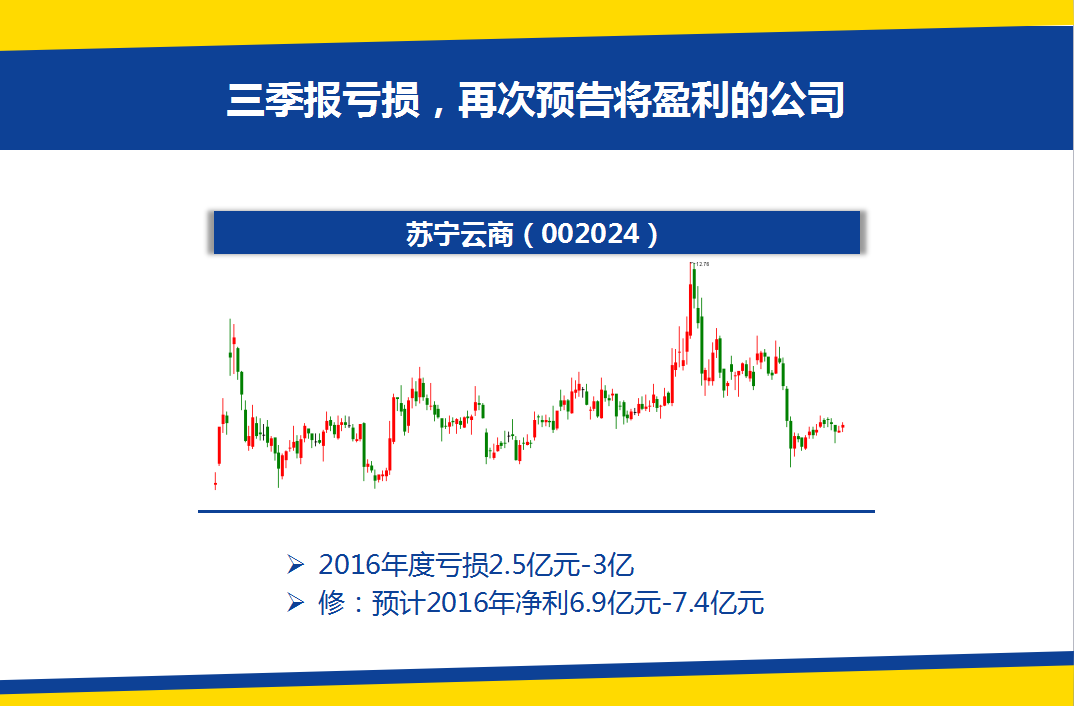 除了3季度亏损又扭亏的,还有19家公司原本预告亏损,再次预告将盈利,如苏宁云商在三季报中预计2016年度亏损2.5亿元-3亿元,今年1月发布业绩预告修正公告,预计2016年净利6.9亿元-7.4亿元。