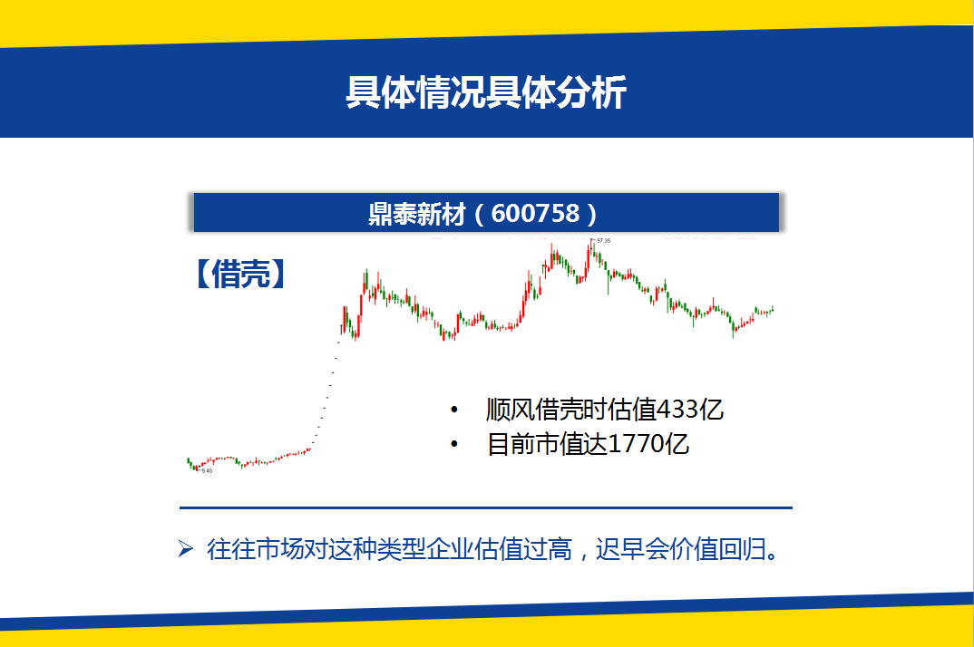 这种情况最为复杂,往往市场都会对这种类型的企业估值过高,例如顺风借壳的鼎泰新材,以顺风借壳时估值433亿来看,本身就存在一定的溢价了,而现在鼎泰新材的市值居然已经达到了1770亿之多,高出原顺风估值的4倍以上。历史经验告诉我们,迟早会价值回归的。