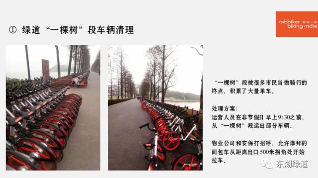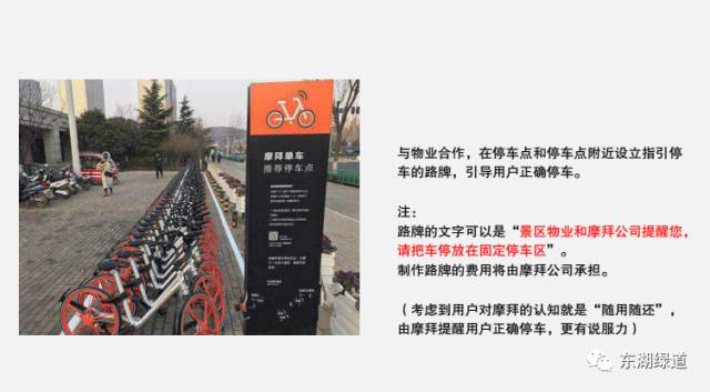 而随后摩拜公司回复了东湖绿道物业管理公司,拿出了《摩拜东湖绿道车辆综合管理方案》,方案中明确提出,将为景区修改“随时随地、随借随还”的运营原则。