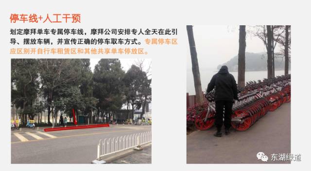 该公司现场负责人介绍,摩拜单车在东湖绿道的投放车辆主要集中在风光村附近。东湖绿道上的大部分车是由市民骑行至此停放。为了规范东湖绿道上摩拜单车的停放,避免影响他人,摩拜单车武汉公司聘请兼职人员对车辆停放进行管理。