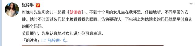 参加完节目后张梓琳在微博说,不到十个月的女儿,仔细地听,仿佛要确认一下电视上为她读书的妈妈就是平时身边的那个妈妈。节目播毕,先生认真地对女儿说:你可真幸运。