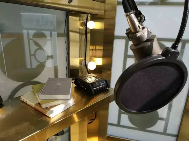 有专业的录音设备,头顶有一个摄像头,门一关,亭子里的动作和声音外边就看不到听不到了,朗读者可以对着圆形的麦克风念,外面的制作人员遥控指挥设备。