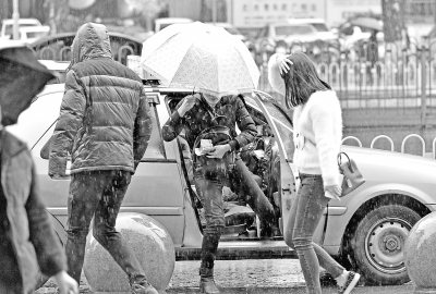 昨天(21日)下午,在汉口解放大道武广门前,乘客冒雨争“抢”出租车(喻志勇 摄)