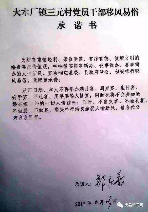 二是各村成立了红白理事会,村书记任理事长,明确待客范围(即婚事新办,丧事俭办,喜事简办,除婚丧嫁娶外一律不办),规定接待标准,组织村民签订《拒绝人情风承诺书》,对本村违规举办人情宴要提前告知并制止到位,明确村干部工作落实的惩处和奖励政策。截至目前,全镇上下已有3000多名村民签订了承诺书。