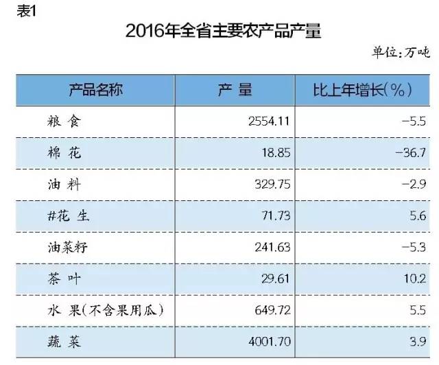 全年全省农林牧渔业增加值3780.79亿元,按可比价格计算,比上年增长4.0%。粮食种植面积4436.87千公顷,比上年减少29.17千公顷;棉花种植面积202.51千公顷,减少62.23千公顷;油料种植面积1452.91千公顷,减少71.28千公顷。粮食总产量2554.11万吨,比上年减少149.17万吨,下降5.5%;棉花总产量18.85万吨,减少10.91万吨,下降36.7%;油料产量329.75万吨,减少9.85万吨,下降2.9%。