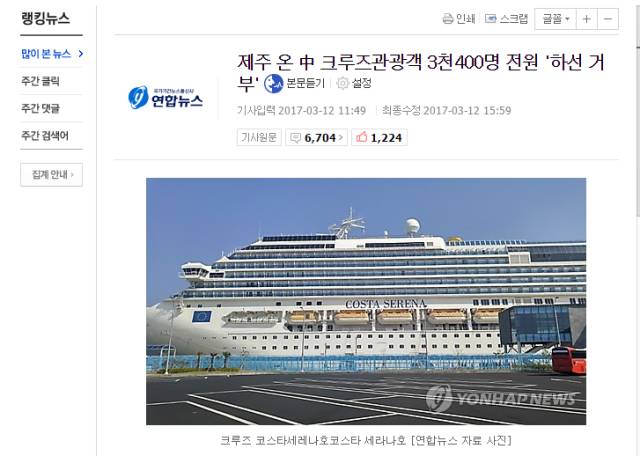 此次歌诗达邮轮赛琳娜号从日本福冈驶来,在经过4小时后,于11日下午5时离开济州,驶往下一目的地天津港。据了解,这是国际邮轮从1990年代末停靠济州以来,20多年间首次有乘客集体拒绝下船事件发生。