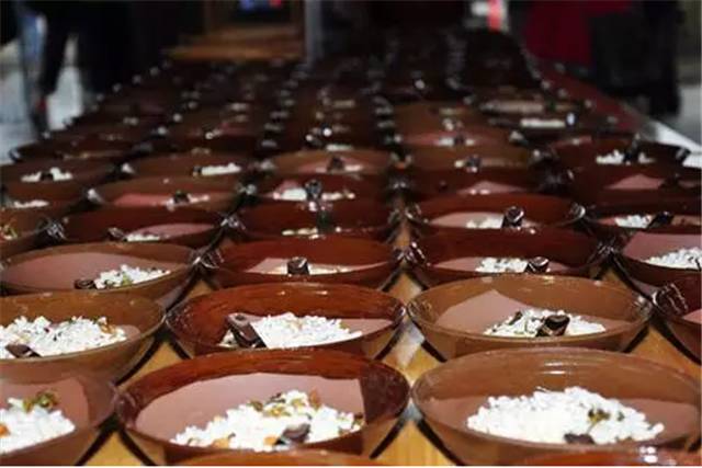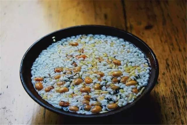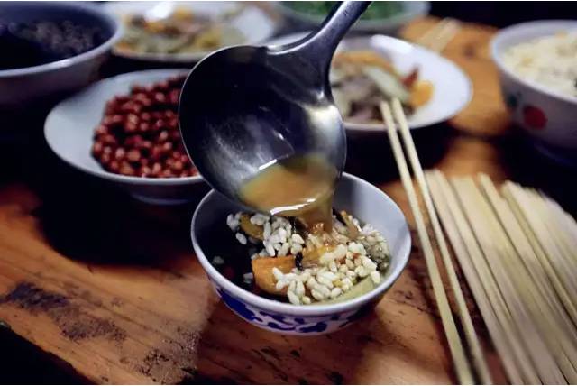 会喝油茶汤的人,在喝汤的同时,连同油炸茶叶、苞米花、桃仁等均匀喝进口里。