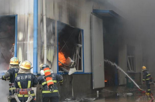 11时08分,大冶消防中队官兵赶到现场后发现,现场黑烟弥漫,厂房内火势正猛烈燃烧。见此情况,中队指挥员立即下令侦查组对现场进行侦查确认有无人员被困情况,灭火组对火势进行控制,警戒组对现场进行警戒,疏散组疏散周边围观群众。经过现场消防官兵10分钟左右的紧张扑救,起火厂房明火被成功扑灭,随后,消防官兵深入厂房内部对余火进行清理。