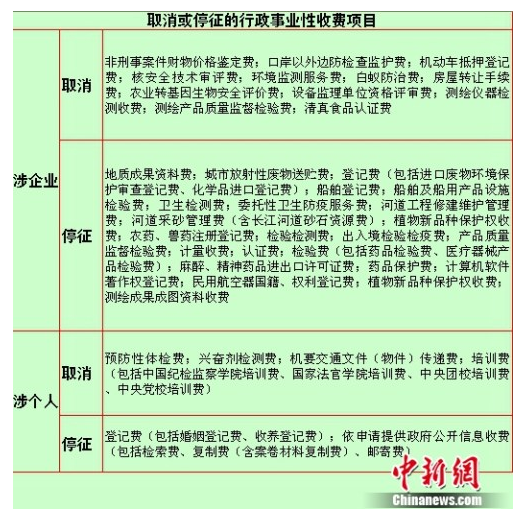 其中,取消或停征的涉及个人等事项的行政事业性收费包括:登记费(包括婚姻登记费和收养登记费)、依申请提供政府公开信息收费、预防性体检费、兴奋剂检测费、机要交通文件(物件)传递费、培训费(包括中国纪检监察学院培训费、国家法官学院培训费、中央团校培训费、中央党校培训费)。
