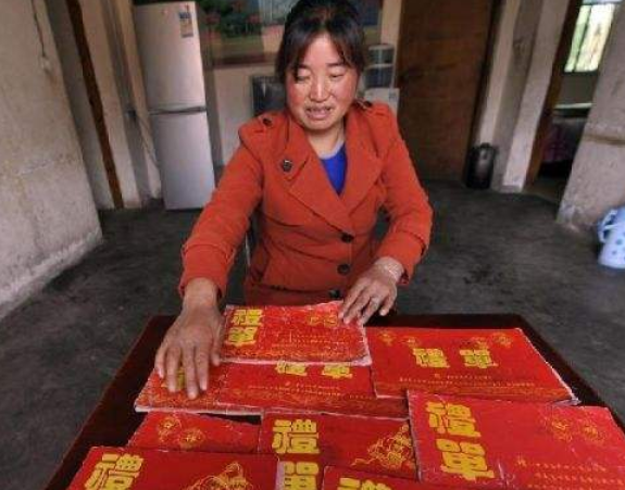 (图为房县青峰镇青峰街村村民刘山英展示家中保存往年的收礼单)