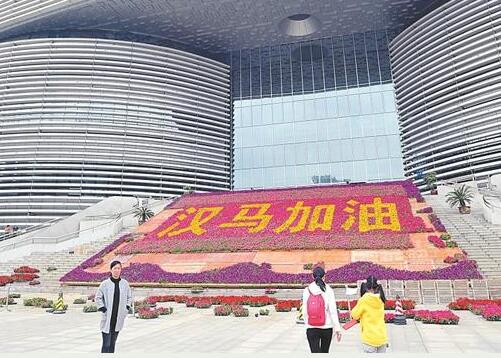 图为:湖北省图书馆门前主题为“汉马加油”的大型摆花(记者万多摄)