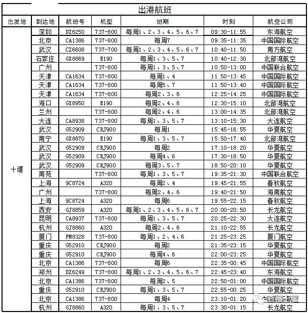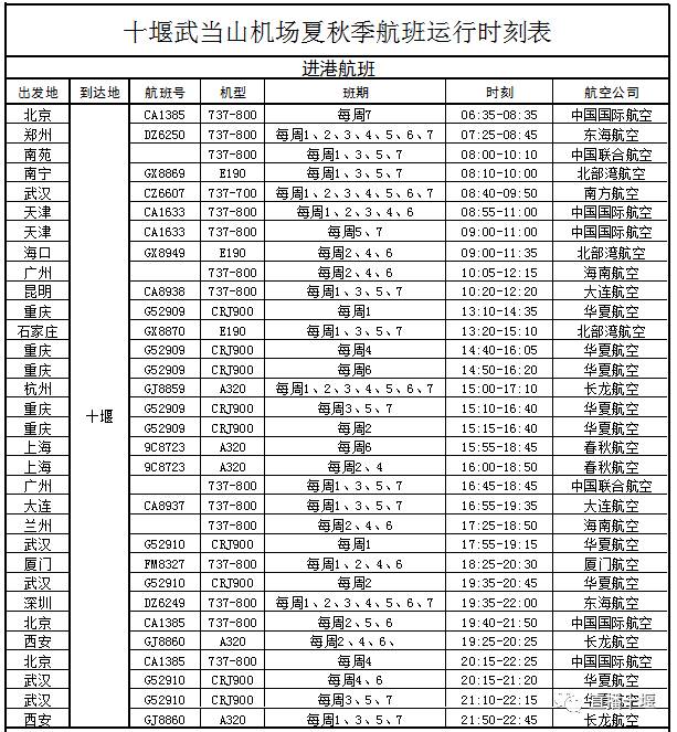 武当山机场最新航班时刻表
