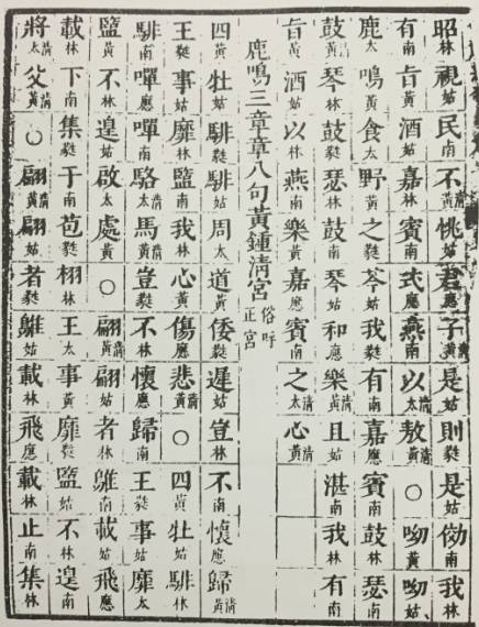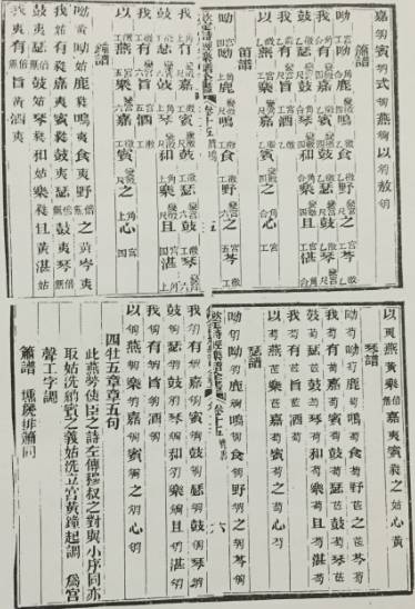 自朱子《仪礼经传通解》以来,所传诗谱,如朱载堉《风雅十二诗谱》、张蔚然《三百篇声谱》、陈澧《风雅十二诗谱考》、《律音汇考声字谱》等,虽皆只把一首诗做一个整体看,一字一音,标识其声。