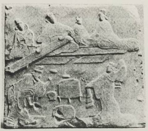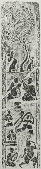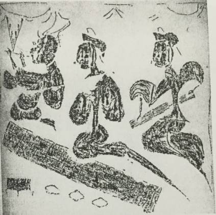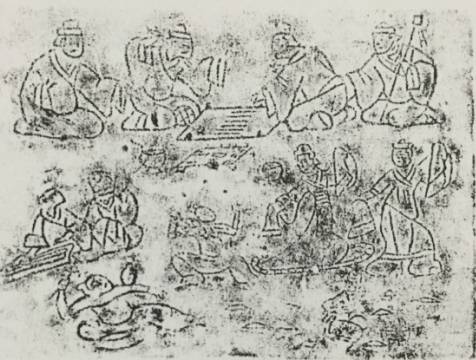 河南新野后岗伎乐画像砖则是笙和琴合奏的。三人并列跽坐,左者吹笙;中者双手置胸作拍击状,似讴歌者;右一人膝上置琴,双手抚奏,六弦。