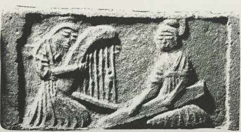 甘肃酒泉果园西汉墓伎乐画像砖更特别,乃是两人跽坐,左侧弹箜篌,右侧抚琴,琴置膝上。