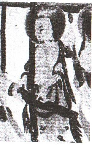 第四二三窟西坡一菩萨站立抚琴,与三二二窟窟顶南坡飞天伎乐一样,亦为整体伎乐之一部。