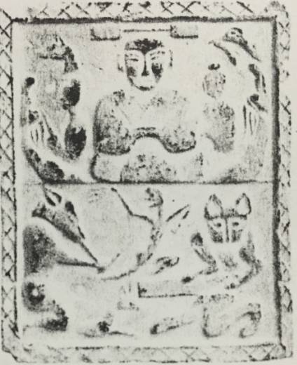 四川彭山江口镇梅花村汉墓西王母神兽奏乐画像砖,也是上部为西王母图,下部神兽奏乐,其中熊形神兽跽坐抚琴。