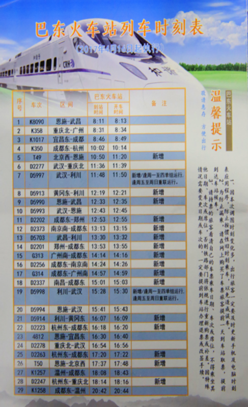 新增开行的列车均集中在上午10点至下午18点前,增多了去往北京、广州、南京等方向的特快、高铁动车,让旅客出行选择更为便捷、多样。同时,根据此路段周末武汉方向客流大且集中的特点,铁路部门将合理配置运能,增大运输能力,以满足巴东、利川、恩施、建始、宜昌东站旅客周末出行的需要。此外,去往宜昌或恩施方向的列车基本每半小时一趟,实现铁路的公交化运输。