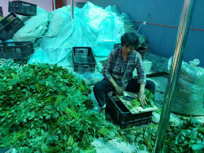 原来,村内有杨堡河和高桥河两条河并肩流过,属冲击平原,不仅水量丰沛,而且土质松软属油沙土,蔬菜产量高。苕叶尖是省农科院研究的台湾空心菜和湖北优质红著杂交的绿色可持续发展产品,无毛滑润香脆,口感好。因对水要求严格,用地下水种不了,只能用没有污染的地面河流灌,纵观市场行情整个北方菜场和南方菜场均有大量需求。