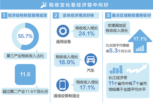 其中,现代服务业税收增长强劲,显示经济结构转型进一步取得成效:一季度第三产业税收收入占比超过第二产业11.6个百分点,“尤其是现代服务业中互联网服务、信息技术服务等信息产业蓬勃发展,税收收入分别增长61.4%和42.1%。”郑小英说。