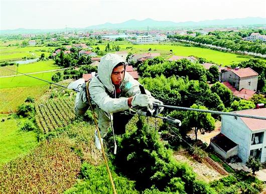 4月17日,记者随他巡线。巡至潜江兴隆的500千伏江兴I回线0205号高压铁塔时,他发现高压线上有一个彩色风筝,如果不及时清除,随时都会造成高压线断电的可能。着屏蔽服,进行安全测试等工作就绪,胡洪炜攀上几十米高的铁塔,用软梯摆渡上高压线,带电作业,取下这个大风筝。像这样排除故障的事,几乎每天都会遇到。他说,如果停电检修,对沿线企业会造成损失,带电作业成为必然选择。