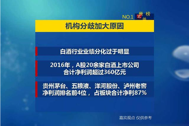 2016年,A股20余家白酒上市公司合计营业收入突破1200亿元,合计净利润超过360亿元。但白酒企业两极分化现象甚为严重。贵州茅台、五粮液、洋河股份、泸州老窖净利润排名前4位,占白酒板块合计净利的87%。