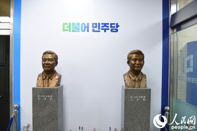 共同民主党党部一楼陈列着金大中(左)和卢武铉(右)前总统的半身铜像。这两位曾代表该党成功当选韩国总统。暌违十年,为了再次成为执政党,共同民主党的每位成员都不惜通宵达旦地开展各项竞选活动,努力争取民众手中的每一张选票。