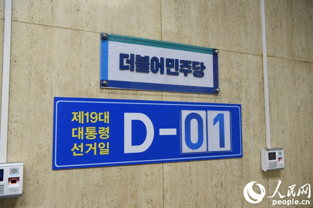 大楼外悬挂着文在寅的巨幅海报,让人很容易辨认出这里是共同民主党的党部。共同民主党党部位于韩国国会对面的一幢大楼内。大选期间,大楼警备森严,竞选团队工作人员忙碌不停,空气中到处弥漫着大战来袭的紧张氛围。