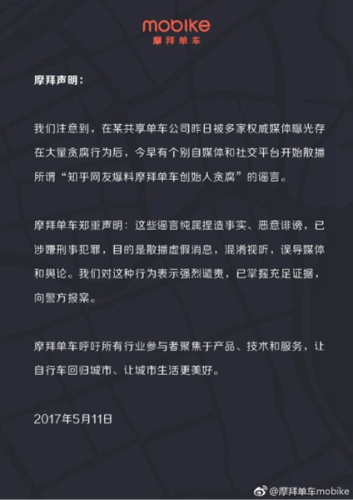 摩拜11日发布声明称,“今早有个别自媒体和社交平台开始散播所谓‘知乎网友爆料摩拜单车创始人贪腐’的谣言。”