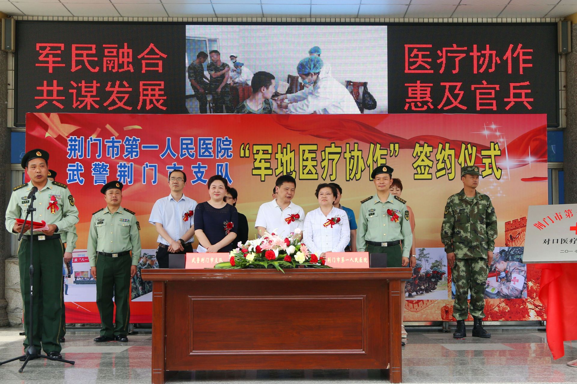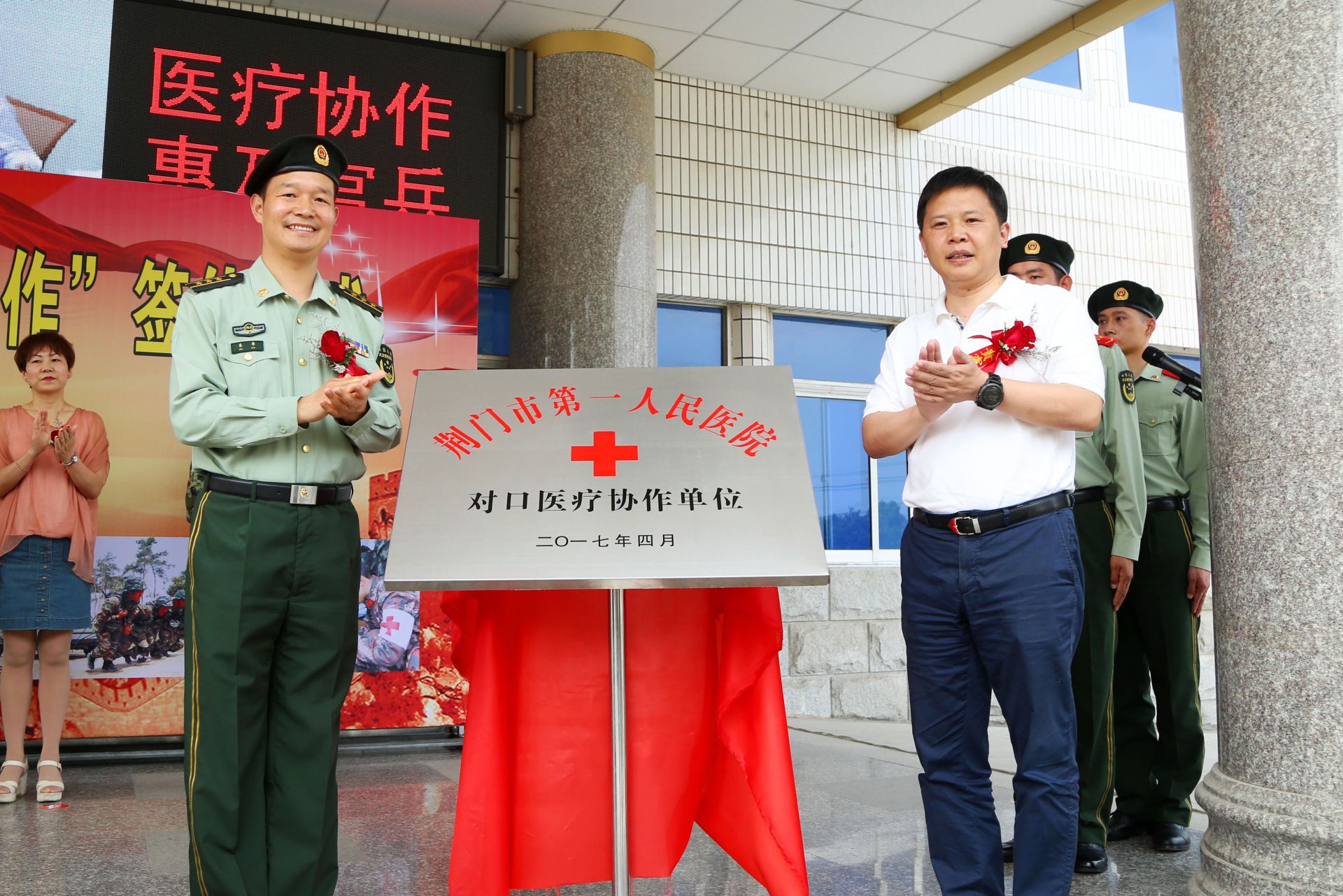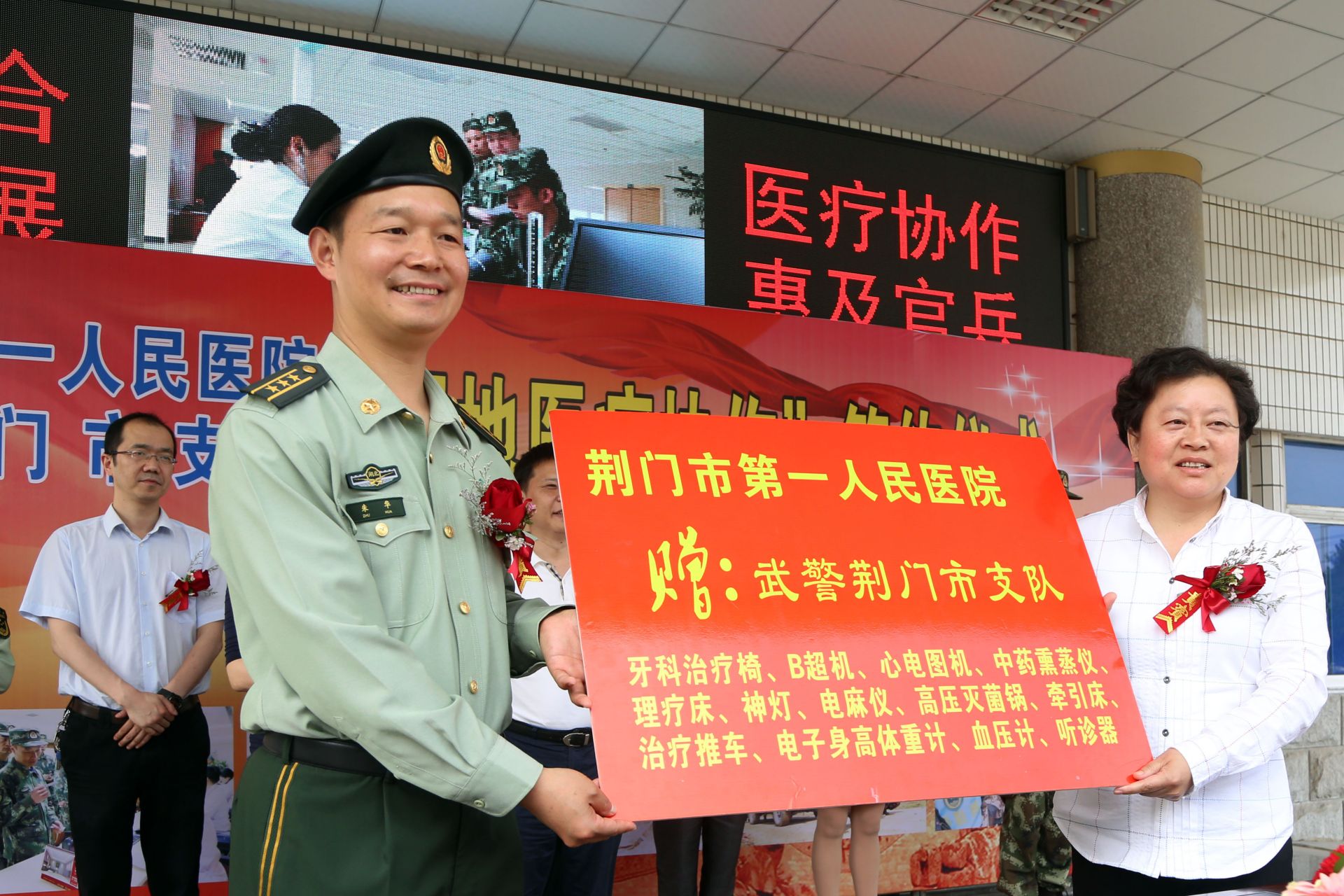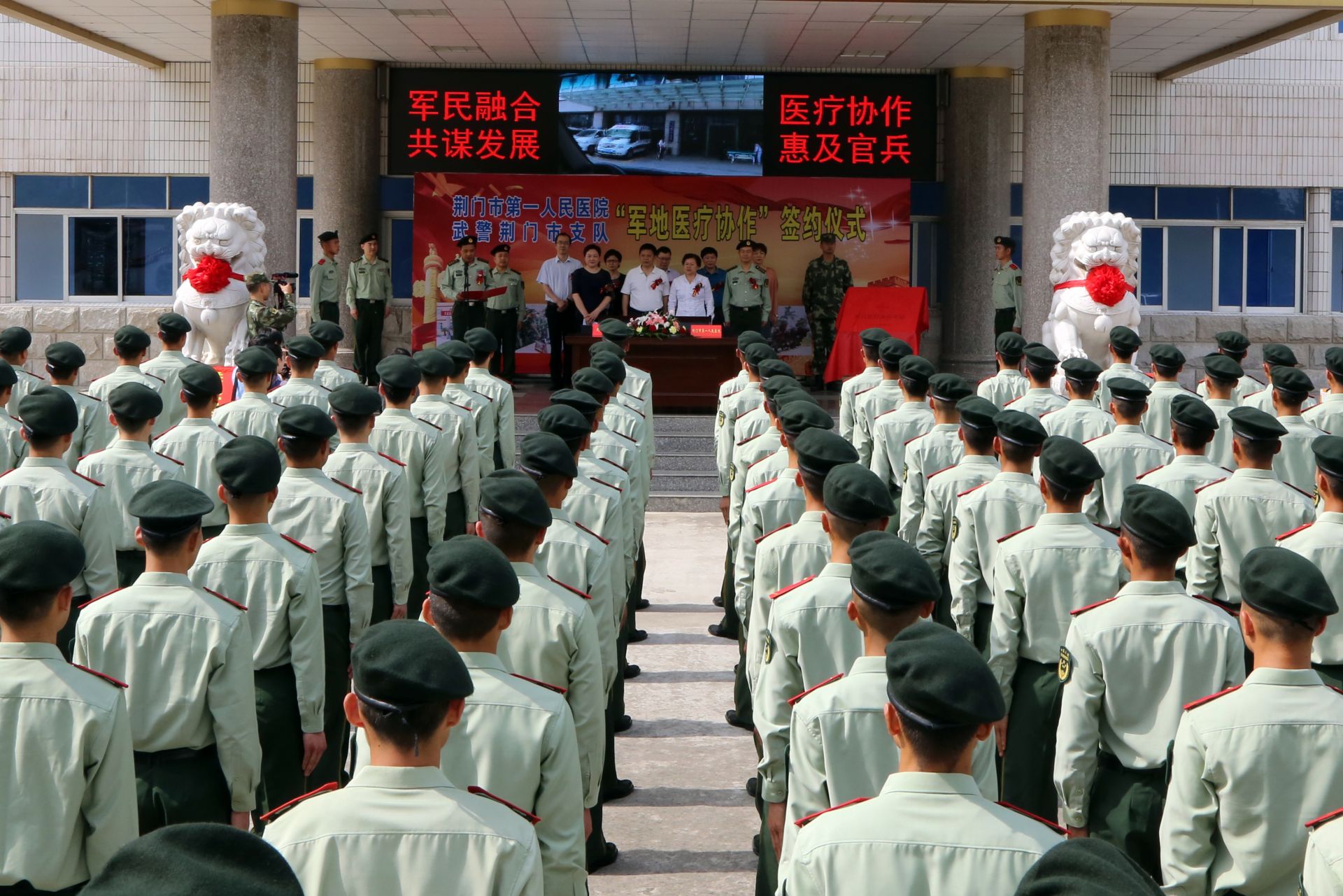 经过论证协商,荆门市卫生计生委、武警荆门市支队与荆门市第一人民医院三方,共同制定了军地医疗保障协作协议,并于近日举行“军地医疗保障协作签字及揭牌仪式”。自协议签订之日起,荆门市第一人民医院为武警荆门市支队“平、战”时医疗保障定点协作医院。荆门一医将每年为支队官兵进行一次全面健康体检,每季度派出医疗专家深入基层部队巡诊送药,定期为支队官兵开展健康宣讲,派出医疗分队随行保障部队重大任务,并免费接收武警支队卫生人员到相关岗位进修培训,对官兵体检、就诊费用进行全免等。