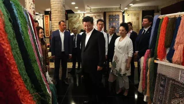 △ 2016年6月21日,习近平和夫人彭丽媛在乌兹别克斯坦布哈拉古城参观一家地毯和丝绸作坊。新华社记者兰红光摄