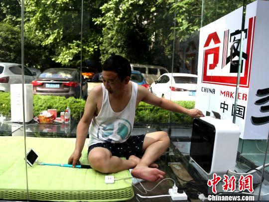 图为创业者安鸿先生在透明玻璃房子里用手机直播自己24小时生活,100天里他要完成项目计划书、团队建设、资本对接创业的全过程。 张畅 摄
