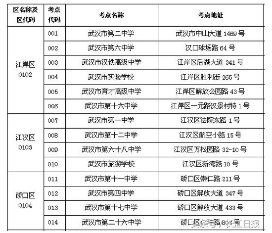 武汉市招考办有关人士提醒,6月6日下午看考场时,务必要明确考点方位,问清楚考点到底是在初中部,还是高中部。如武汉一中(法院东路1号)是高考考点,武汉一初慧泉中学(民主一街187号)不是考点;育才高中(解放公园路43号)是考点,育才美术高中(工农兵路)不是。