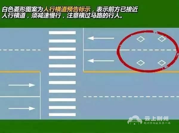 白色菱形为人行横道预告标志,设置在斑马线前30米处,它的作用是用来提示驾驶员,前方已接近人行横道,应减速慢行,并须注意行人横过马路,并做好让行准备。