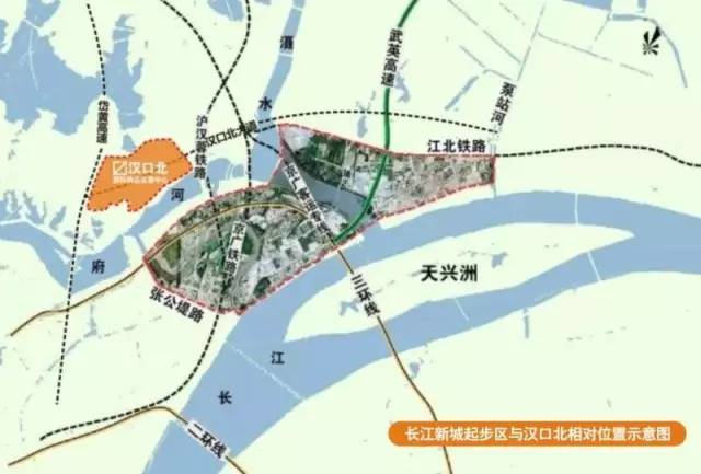 根据规划,长江新城起步区谌家矶—武湖区块具体方位是:东至武湖泵站河,南至长江北岸,西至滠水河、府河,西南至张公堤路,北至江北铁路,约30到50平方公里。中期发展区100平方公里,远程控制区500平方公里。