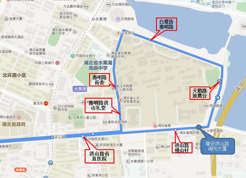 首末站不变(首站三眼桥路元辰世纪,末站八一路东湖新村),中途走向由原八一路、东一路、水果湖路、东湖路调整为八一路、珞狮路、洪山侧路、东一路至水果湖路恢复原线,填补洪山侧路附近居民往中南医院、省老年大学、东湖绿道方向的出行空白。