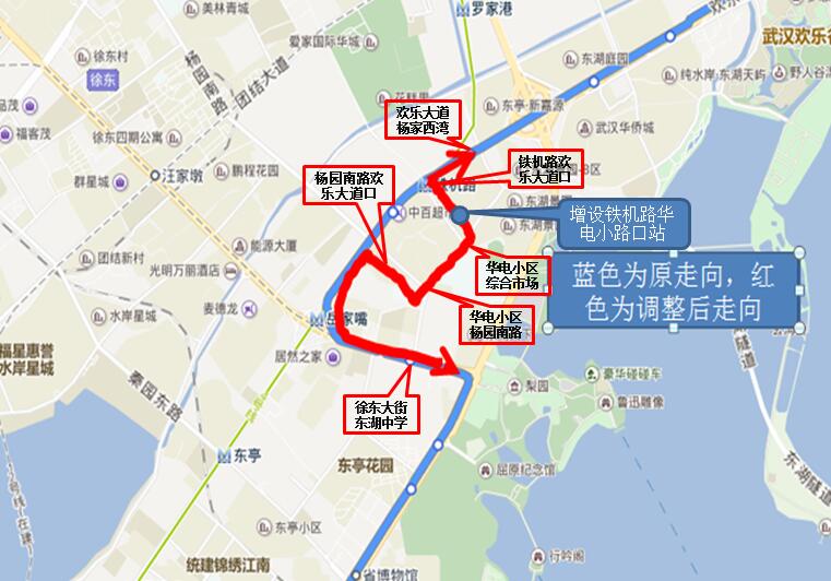 首末站不变(首站欢乐大道欢乐谷,末站华丽环保工业园),中途走向由欢乐大道、徐东大街、东湖路调整为欢乐大道、铁机路、华电小路、杨园南路至欢乐大道恢复原线,解决岳家嘴小区居民到水果湖地区上班的出行需求。