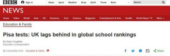 BBC报道《英国在PISA考试的全球排名中落后》。